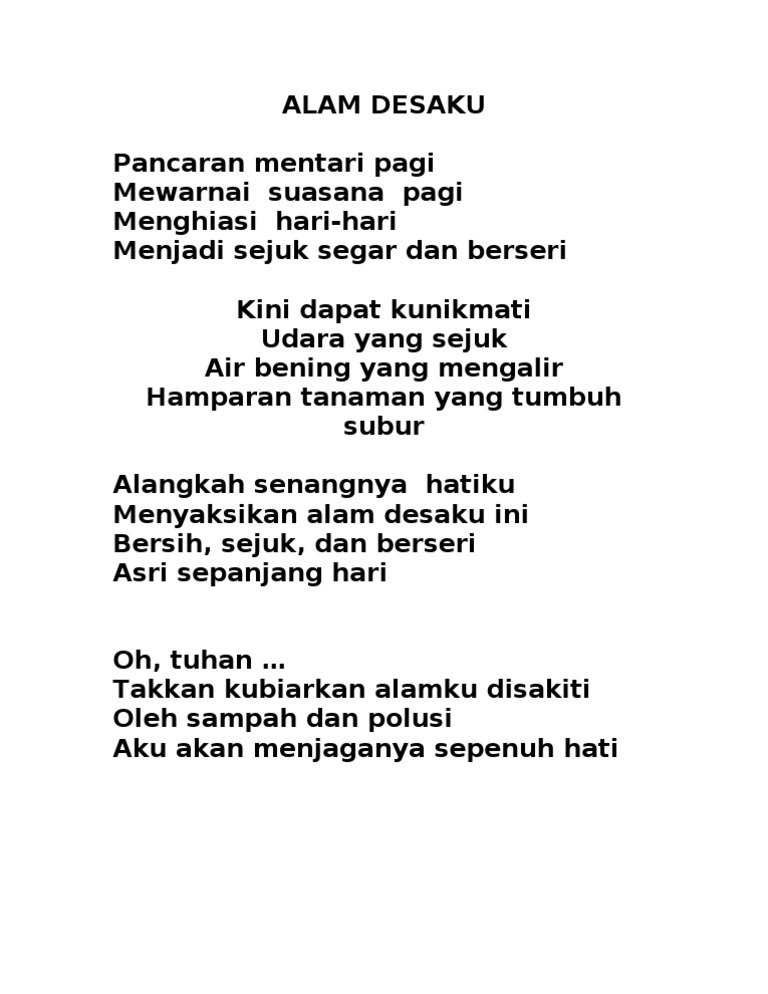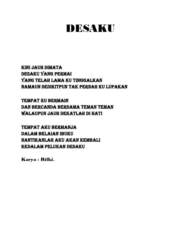 Puisi desaku terdiri dari beberapa bait. 8 Contoh Puisi Desaku yang Indah Puisi ialah salah satu bentuk dari karya sastra yang disampaikan dengan gaya bahasa yang singkat dan bermakna. Lapar menyerang desaku Kentang dipanggang kemarau Surat orang kampungku Kuguratkan kertas Risau Lapar lautan pidato Ranah dipanggang kemarau Ketika berduyun mengemis Kesinikan.