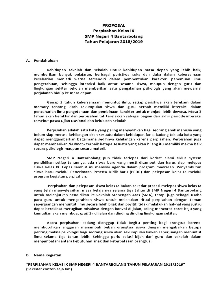 Proposal Perpisahan SMP Tahun 2018doc Unduh Demikian Contoh Proposal Kegiatan Perpisahan kelas 9 jenjang SMPMTs Tahun 2018 atau Tahun pelajaran 20172018 yang dapat saya bagikan semoga bermanfaat. Buat yang bingung buat proposalnya. Penutup Demikian proposal kegiatan perpisahan kelas XII SMA Negeri 1 Lingga tahun pelajaran 20152016 kamisangat mengharapkan bantuan dan peran serta BapakIbuSaudara agar kegiatan yang telah kami sepakati untuk diadakan dapat terlaksana dengan baik.