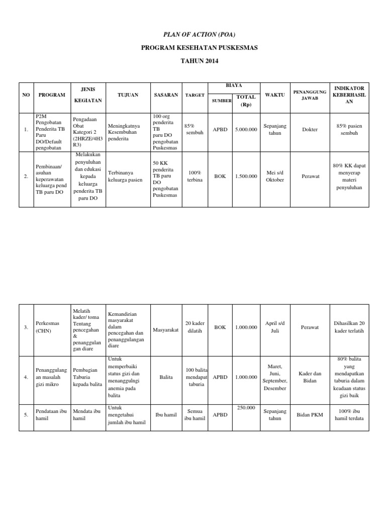 Plan Of Action Poa Program Kesehatan Puskesmas Tahun 2014
