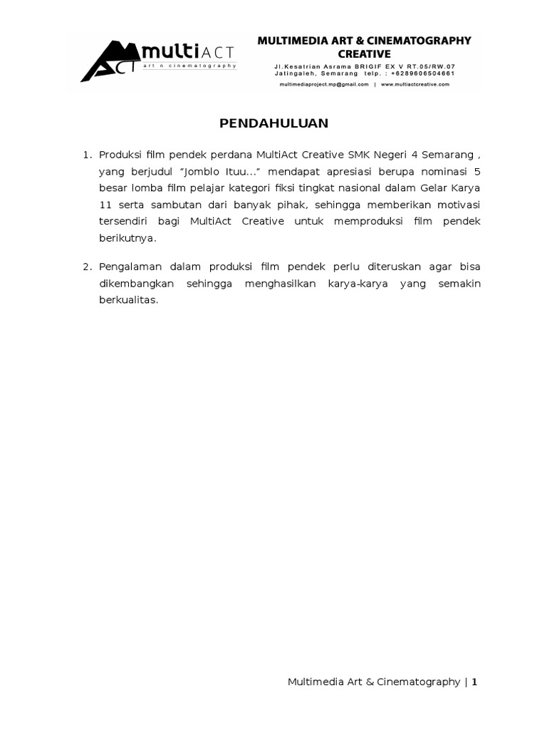 Doc Proposal Produksi Film Pendekdocx Ahmad Fahrudin. Blog Contohdhi memiliki banyak koleksi gambar seperti Contoh Proposal Film Layar Lebar. Apa saja hal yang perlu dicantumkan dan dilampirkan di dalam proposal tersebut.