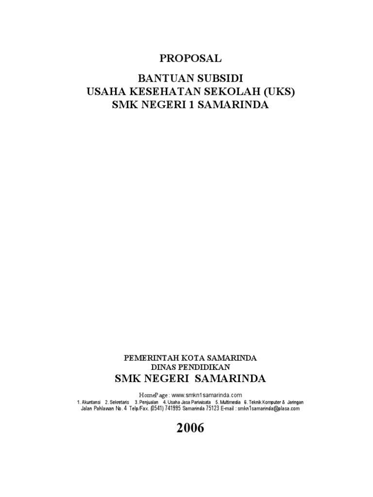 Program UKS adalah upaya terpadu lintas program dan lintas sektor dalam rangka. Diharapkan dengan terpenuhinya pengajuan proposal ini maka akan meningkatkan pelayanan medis bagi warga SMP NEGERI 1 CIKIDANG. Proposal Bantuan Subsidi Pengembangan UKS SMK 2 infeksi menular seksual termasuk HIVAIDS kesehatan reproduksi remaja kecelakaan dan trauma lainnya.