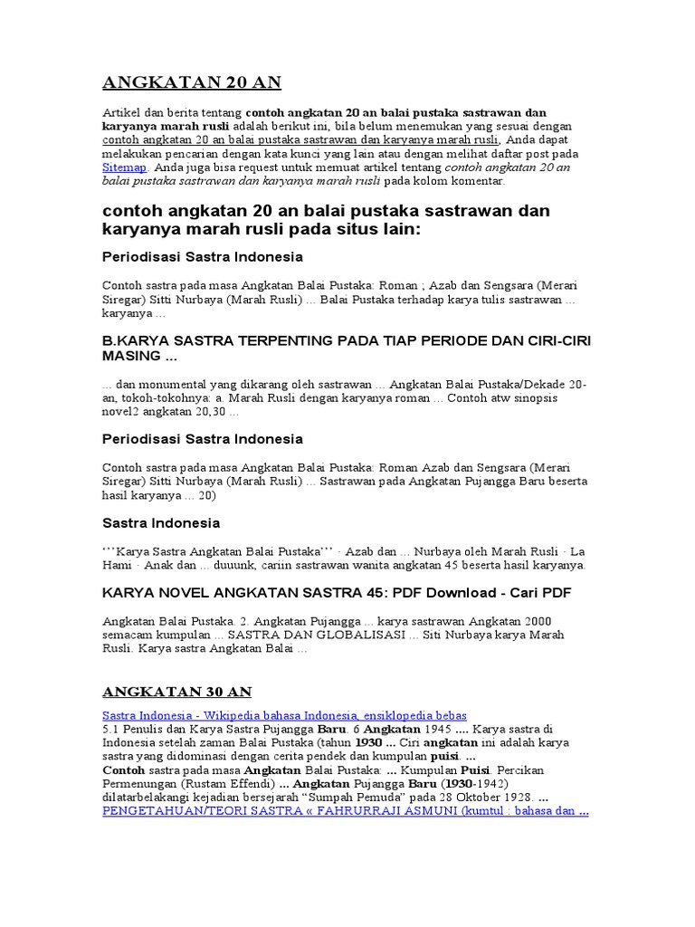 Contoh puisi angkatan 20. Isinya masih mirip dengan Angkatan 20-an tendensius dan didaktis 6. Contoh Karya Sastra dari Tahun 20 an - 2000 Angkatan 20-an SITI NURBAYA Karya Marah Rusli Roman Angkatan Balai Pustaka Penerima hadiah tahunan pemerintahan RI. Berharta bukan berhakpun bukan.
