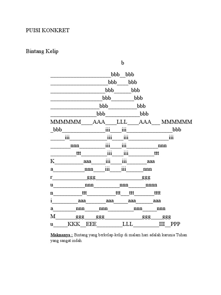 Puisi Konkret Puisi konkret merupakan puisi yang menitikberatkan tampilan grafis pada susunan katanya. Susunan grafis dapat menyerupai gambar tertentu. Cara Menulis Puisi.