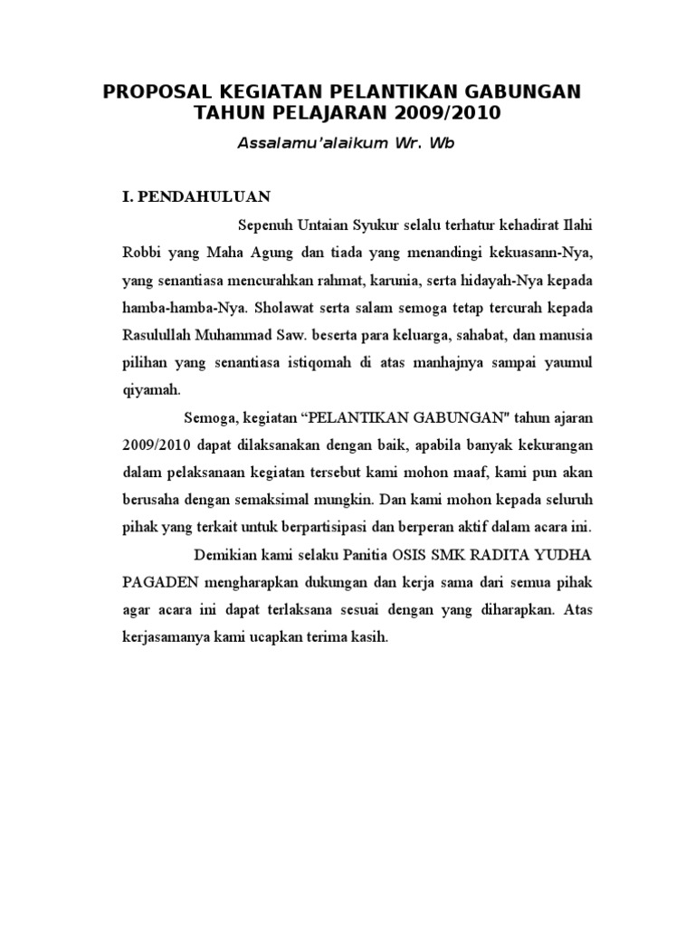 Contoh Proposal Kegiatan Sekolah. Proposal kegiatan pelantikan pengurus osis danpengurus ambalan ki hajar dewantara dan kristina martha tiahahu sma nasional pati ADASAR PEMIKIRAN Organisasi Siswa Intra Sekolah OSIS adalah organisasi yang terbentuk di dalam lingkungan sekolah. Contoh proposal kegiatan sekolah 17 Agustus.