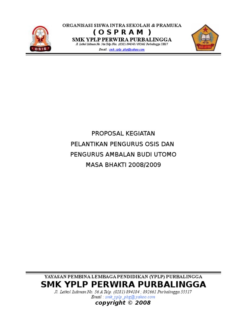 0700 SD Selesai Tempat. PROPOSAL KEGIATAN PELANTIKAN PENGURUS OSIS DAN PENGURUS AMBALAN BUDI UTOMO MASA BHAKTI 20082009. Contoh Proposal Kegiatan Sekolah.