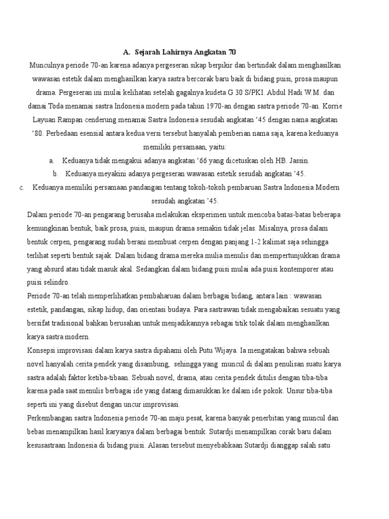 Salah satu tokoh yang berpandangan bahwa kesusastraan Indonesia mengalami kemunduran adalah. Pengarang yang dapat dikelompokan ke dalam akangkatan 70 adalah. Angkatan 70-an diberi nama ole h Abdul Hadi WM dan Dami N.