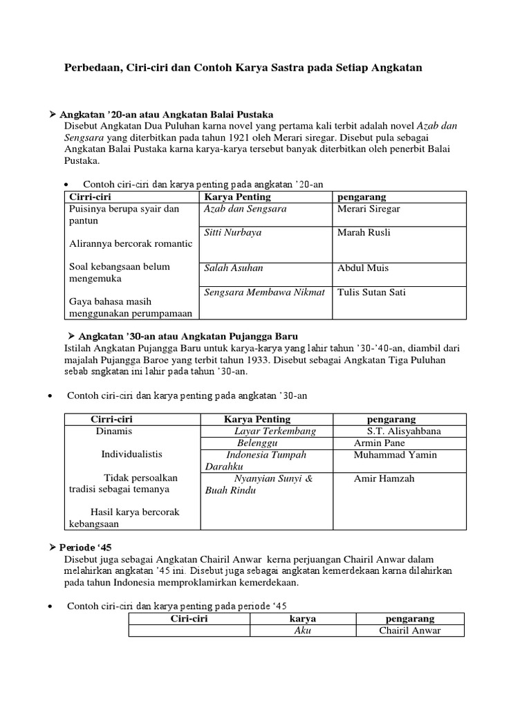 Perbedaan Ciri Ciri Dan Contoh Karya Sastra Pada Setiap Angkatan