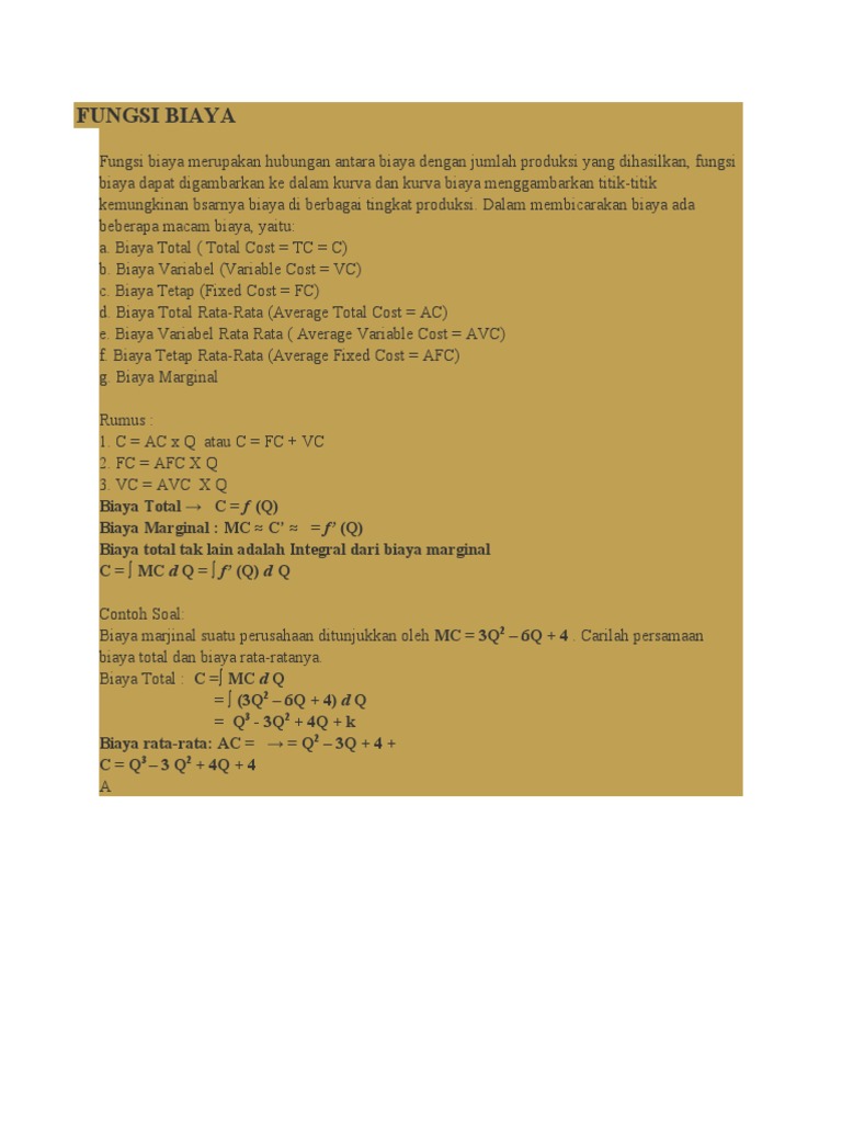 Contoh Soal Fungsi Biaya Total Matematika Ekonomi. Fungsi Total Biaya suatu perusahaan dinyatakan sebagai berikut. Fungsi permintaan suatu barang ditunjukkan oleh persamaan P 100 - Q a.