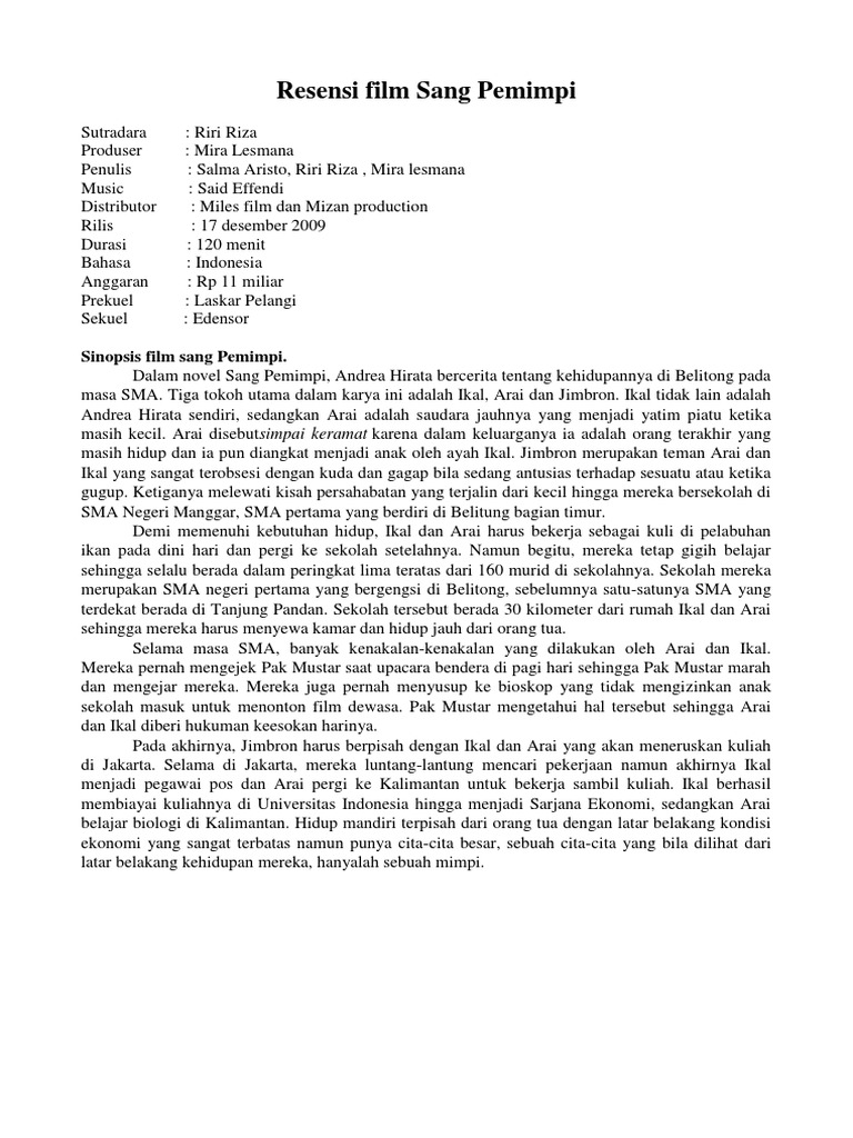 Sang Pemimpi Penulis. Dia adalah Dilanku Tahun 1990 11. Contoh Resensi Film Sang Pemimpi Identitas Film Judul Film.