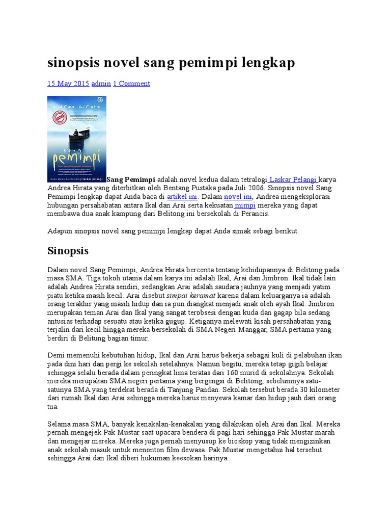 ISBN 970 3062 79 7. Novel Sang Pemimpi menceritakan tentang sebuah kehidupan tiga orang Melayu Belitong yaitu Ikal Arai dan Jimbron yang penuh. RESENSI NOVEL INDONESIA SANG PEMIMPI 1.