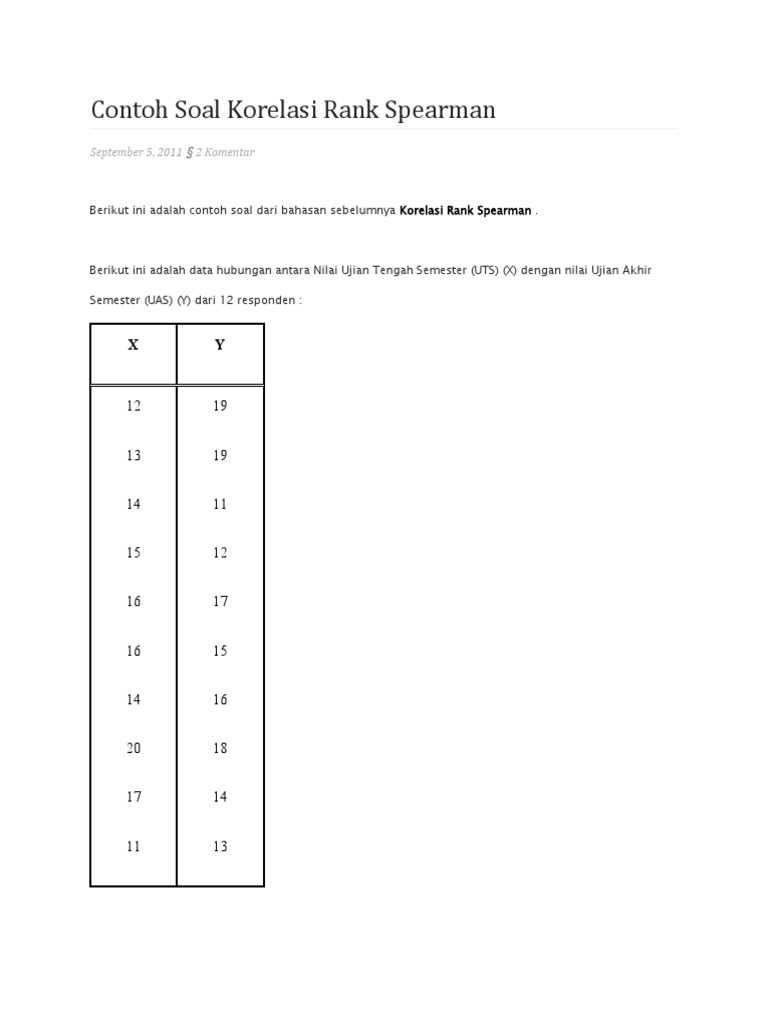Contoh soal korelasi rank spearman. Contoh Sebuah penelitian dilakukan untuk mengetahui korelasi antara Kadar SGOT Unit Karmen100ml dengan Kolesterol HDL mg100ml pada 7 sampel yang diambil secara random. Buktikanlah hipotesis yang berbunyi terdapat hubungan yang positif antara Nilai UTS dan. Berikut ini adalah data hubungan antara Nilai Ujian Tengah Semester UTS X dengan nilai Ujian Akhir Semester UAS Y dari 12 responden.