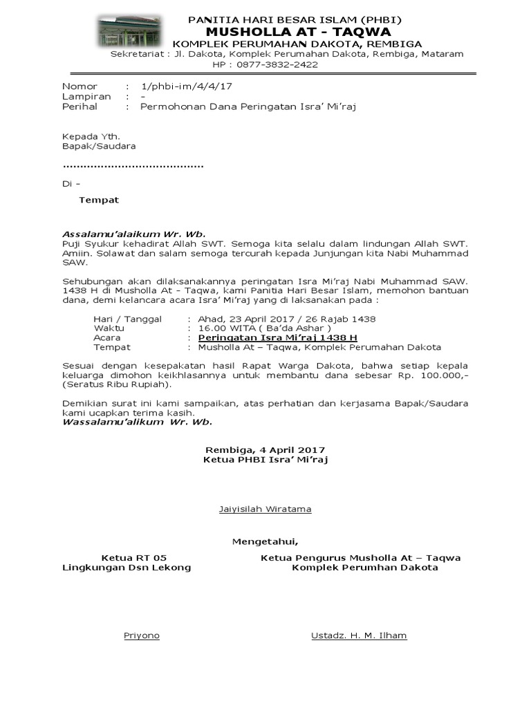 Demikian proposal ini kami buat dengan harapan kegiatan PHBI Isra Miraj Nabi Muhammad SAW di tahun 201 7 ini berjalan lancar sukses dan mendapat apresiasi penuh. Contoh Proposal Kegiatan DocKami segenap panitia peringatan isra mi raj akan menyemarakan hari besar islam ini dengan mengadakan peringatan. Published on January 21 2018.