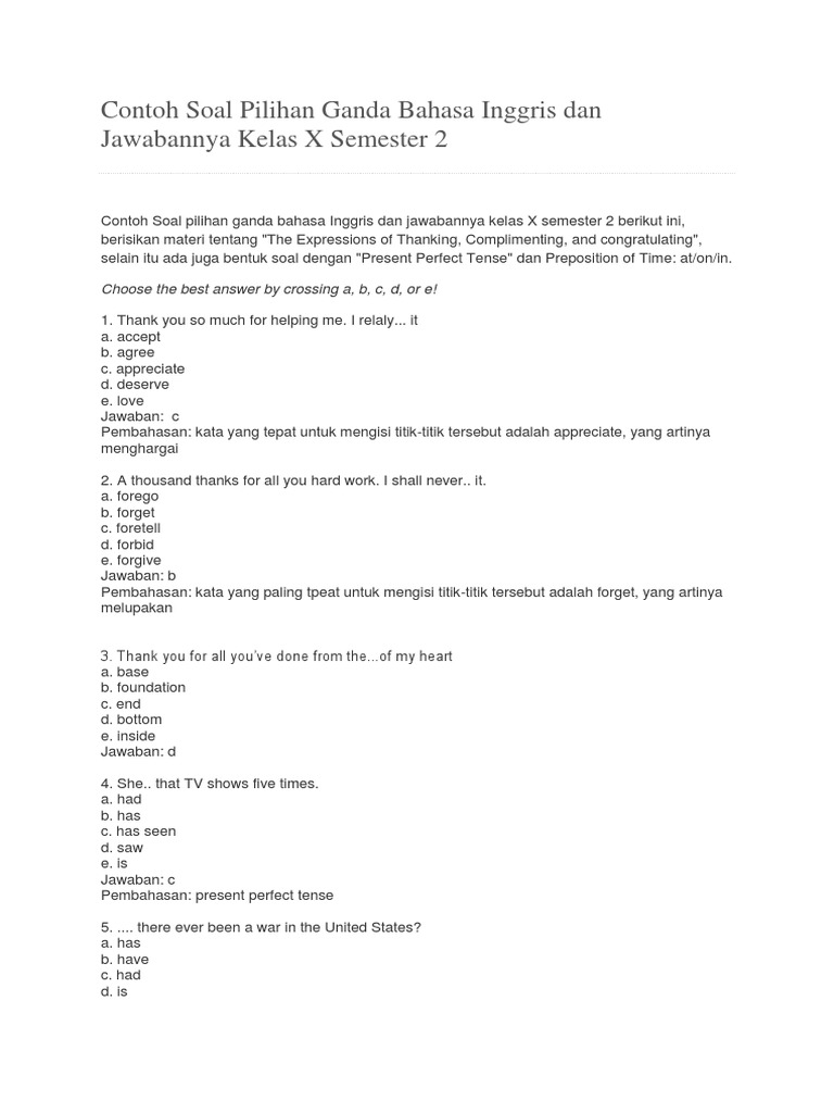 35 Contoh Latihan Soal Bahasa Inggris Pilihan Ganda dan Essay Kelas XII. Contoh Soal Congratulation Pilihan Ganda Dan Jawabannya. Contoh soal pilihan ganda bahasa inggris dan jawabannya kelas x semester 2 berikut ini berisikan materi tentang the expressions of thanking complimenting.