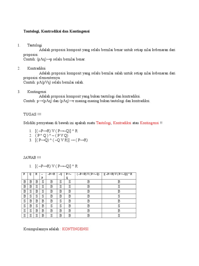 Tautologi Kontradiksi Dan Kontingensi Pdf
