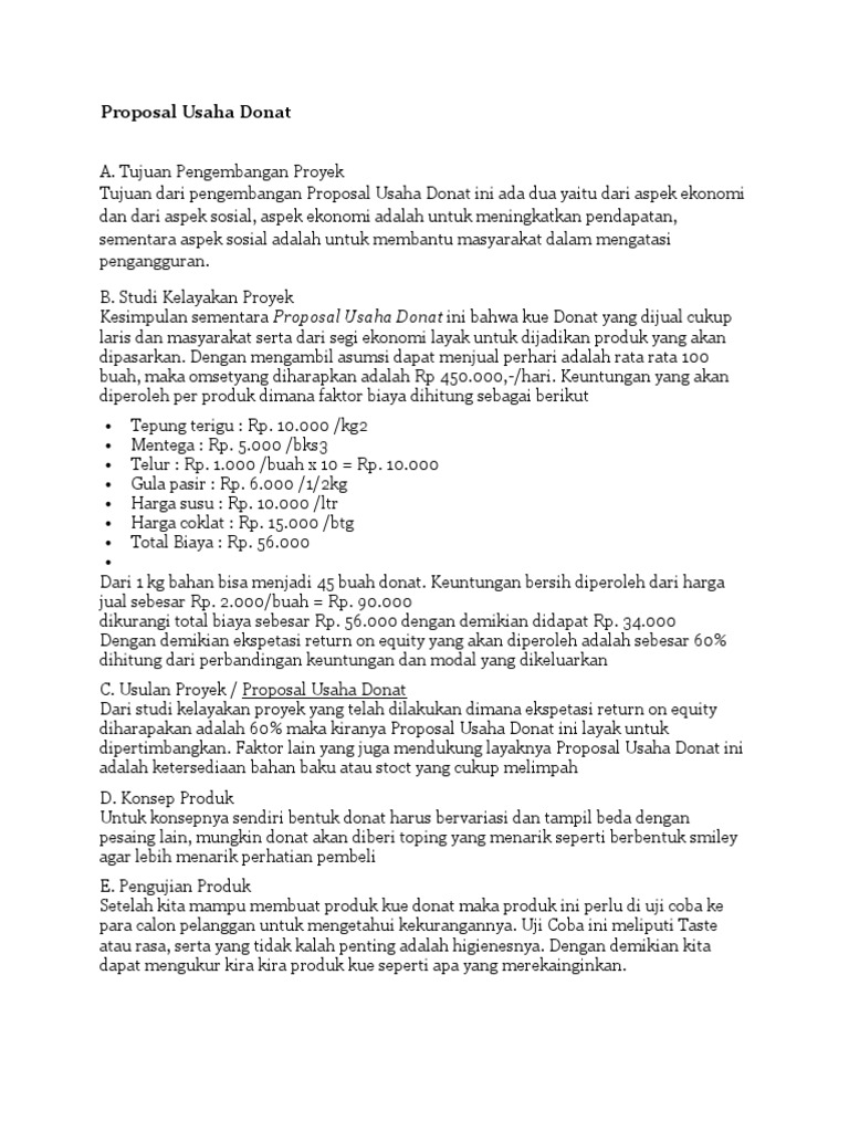 Dari contoh di atas dapat kita simpulkan Produk. Walaupun ini termasuk proposal usaha kecil tetapi baiknya. Setelah selama 5 tahun berkecimpung dalam usaha donat yang dimulai pada tahun 2003.