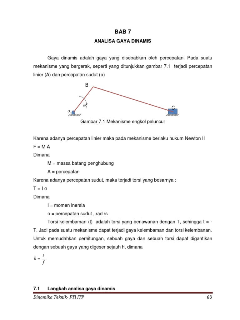 Diktat KINEMATIKA DAN DINAMIKA MESIN Mes 233 Untuk mesin yang bergerak lambat gaya inersia yang bekerja sangat kecil dibanding gaya beratnya sedangkan untuk mesin yang bergerak sangat cepat perlu dipertimbangkan gaya-gaya dinamik yang bekerja. Jumlah joint penuh j4. Kecepatan dan percepatan tersebut diperoleh dalam bentuk yang berguna sebagai informasi untuk memdapatkan gaya gaya dinamik yang bekerja pada elemen elemen mesin.