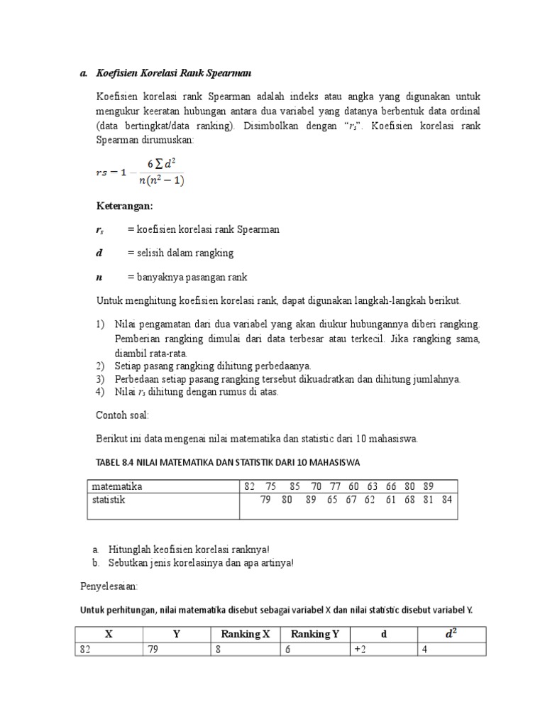 Contoh Soal Dan Jawaban Biostatistika Korelasi Rank SpearmanContoh Soal Dan Jawaban Biostatistika Korelasi Rank Spearman Oleh Sinogo Diposting pada September 6 2020 Koefisien korelasi rank spearman ordinal untuk mengukur keeratan hubungan antara dua variabel x dan y yang kedua duanya mempunyai skala pengukuran sekurang kurangnya ordinal dapat dihitung dengan menggunakan formula korelasi spearman. Uji koefisien korelasi spearmans rank adalah uji statistik untuk menguji 2 variabel yang berdata ordinal atau salah satu variabel berdata ordinal dan lainnya nominal. Statistik Non parametrik Cabang ilmu statistik yang mempelajari prosedur-prosedur inferensial.